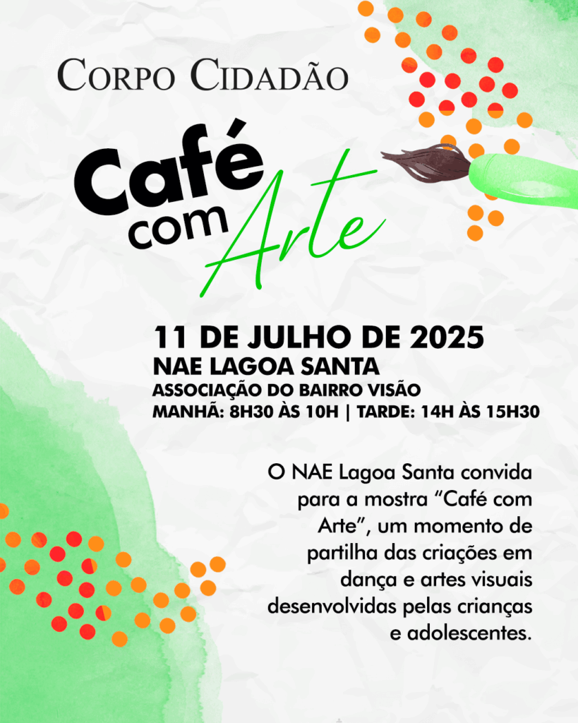 O NAE Lagoa Santa convida para a mostra de meio de ano “Café com Arte”, um momento de partilha das criações em dança e artes visuais desenvolvidas pelas crianças e adolescentes ao longo do semestre.